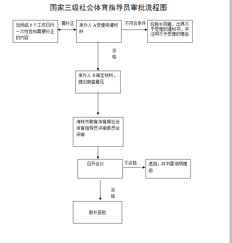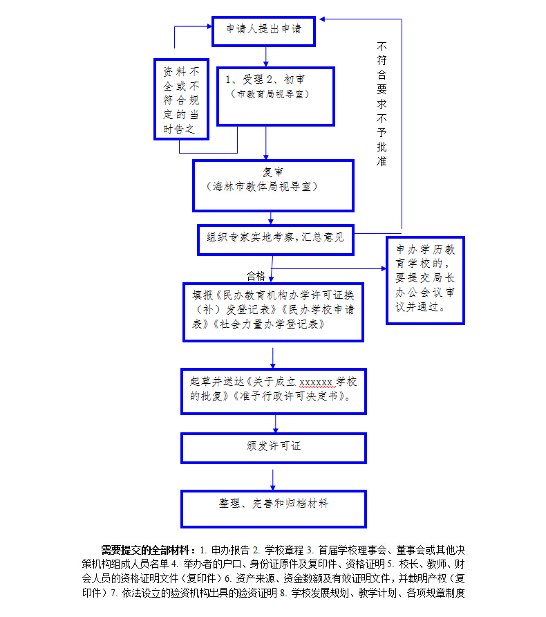 序号 行政权利 名 称 种类 依据 及标准 公开 方式 公开 范围 受理条件 受理 时限 流程图 1. 民办教育机构办学许可 行政许可 《中华人民共和国民办教育促进法(2002年12月28日通过) 《黑龙江省民办教育促进条例》(2007年10月12日) 《黑龙江省教育厅关于印发民办学校设置标准的通知》(黑教法[2005]113号) 网上公开 全社会 1. 申办报告2. 学校章程3. 首届学校理事会、董事会或其他决策机构组成人员名单4. 举办者的户口、身份证原件及复印件、资格证明5. 校长、教师、财会人员的资格证明文件(复印件)6. 资产来源、资金数额及有效证明文件,并载明产权(复印件)7. 依法设立的验资机构出具的验资证明8. 学校发展规划、教学计划、各项规章制度 30个工作日 2 举办非营利 性健身气功活动及站点设立许可 行政许可 《国务院对确需保留的行政审批项目设定行政许可的决定》(2004年6月29日国务院令第412号) 《健身气功管理办法》(2006年11月17日国家体育总局令第9号发布) 网上公开 全社会 申请举办健身气功活动,应当具备下列条件:(一)由具有合法身份的公民、法人或其他组织提出;(二)所涉及的功法,必须是国家体育总局审定批准的健身气功功法;(三)有与所开展活动相适应的场所;(四)有必要的资金和符合标准的设施、器材;(五)有社会体育指导员和管理人员;(六)有活动所在场所管理者同意使用的证明; (七)有相应的安全措施和卫生条件;(八)法律法规规定的其他条件。 申请设立健身气功站点,应当具备下列条件:(一)小型、分散、就地、就近、自愿;(二)布局合理,方便群众,便于管理;(三)不妨碍社会治安、交通和生产、生活秩序;(四)习练的功法为国家体育总局审定批准的健身气功功法;(五)负责人具有合法身份;(六)有社会体育指导员;(七)活动场所、活动时间相对固定。 20工作日 3 经营高危险性体育项目许可 行政许可 《全民健身条例》已经2009年8月19日国务院第77次常务会议通过,现予公布,自2009年10月1日起施行 《经营高危险性体育项目许可管理办法》已于2013年1月28日经国家体育总局第3次局长办公会审议通过,现予公布,自2013年5月1日起施行 网上公开 全社会 经营高危险性体育项目,应当具备下列条件:(一)相关体育设施符合国家标准;(二)具有达到规定数量、取得国家职业资格证书的社会体育指导人员和救助人员;(三)具有安全生产岗位责任制、安全操作规程、突发事件应急预案、体育设施、设备、器材安全检查制度等安全保障制度和措施;(四)法律、法规规定的其他条件。 申请经营高危险性体育项目,应当提交下列材料:(一)申请书。申请书应当包括申请人的名称、住所,拟经营的高危险性体育项目,拟成立经营机构的名称、地址、经营场所等内容;(二)体育设施符合相关国家标准的说明性材料;(三)体育场所的所有权或使用权证明;(四)社会体育指导人员、救助人员的职业资格证明;(五)安全保障制度和措施;(六)法律、法规规定的其他材料。 30个工作日 4 校车使用许可 行政许可 《校车安全管理条例》(2012年3月28日国务院第197次常务会议通过) 网上公开 全社会 (一)车辆符合校车安全国家标准,取得机动车检验合格证明,并已经在公安机关交通管理部门办理注册登记;(二)有取得校车驾驶资格的驾驶人;(三)有包括行驶线路、开行时间和停靠站点的合理可行的校车运行方案;(四)有健全的安全管理制度;(五)已经投保机动车承运人责任保险。 11个工作日 5 转(休、复 )学条件的确认 行政确认 《黑龙江省义务教育阶段学生学籍管理实施细则》(黑教基一[2014]76号) 网上公开 全社会 学生有下列情况之一者应当休学:(1)经医院诊断停课治疗或疗养的时间超过一个学期总学时的三分之一或因患传染病不宜过集体生活和继续学习者; (2)在一个学期内因请假缺课累计超过该学期总学时的三分之一者; (3)因特殊原因本人申请或学校认为应当休学者。 转出手续: ⑴由本人提出书面申请,所在学院主管领导签署意见,报教务处审核。 ⑵审核同意后,由申请者填写《高等学校学生转学申请(确认)表》(一式5份,由申请者在教务处网页上下载),并向学校提供在校期间的鉴定、成绩单、录简表复印件(6份)。 ⑶学校签注意见并盖公章。 ⑷转入学校签注意见并盖公章。 ⑸报甘肃省教育厅和转入学校教育主管部门批准。 ⑹办理离校手续。 转入手续:⑴申请者所在学校来函商转。同时向我校提供申请者在校期间的鉴定、成绩单、加盖学籍管理部门公章的录简表复印件。 ⑵对申请转入我校的学生,在符合转学条件的前提下,由欲转入专业所在学院对其综合素质和专业知识能力进行全面考核后,提出能否转入的意见报教务处。 ⑶对学院同意转入的学生经教务处审查同意后回函。申请者填写《高等学校学生转学申请(确认)表》(一式5份,由申请者在教务处网页上下载),转出学校签注意见并盖公章。 ⑷报主管校长审批,同意后在《高等学校学生转学申请(确认)表》加盖学校公章。 ⑸报甘肃省教育厅和转出学校教育主管部门批准。 ⑹办理转学手续 7个工作日 6 幼儿园 等级认定 行政确认 《国务院关于当前发展学前教育的若干意见》(国发〔2010〕41号) 《黑龙江省学前教育机构登记注册及审批管理办法》(黑教联〔2011〕65 号) 网上公开 全社会 凡经登记注册或审批的学前教育机构,教育行政部门负责对其核定类